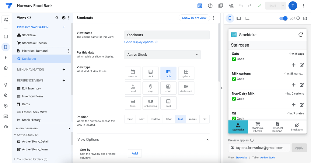 Luckily I happened upon AppSheet – a Google product that creates simple user interfaces that can read, write, and edit Google Sheet Databases.
