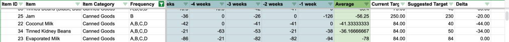 To understand demand, we also needed to get a sense of how much of each item was coming in every week. To do this, I built a sheet specifically to help the person who ordered the food each week. This sheet broke down how much of each item was needed if we were to hit our target inventory levels. Once the orders were placed, and a box ticked, the orders would be saved in another sheet, thus giving us historical orders.